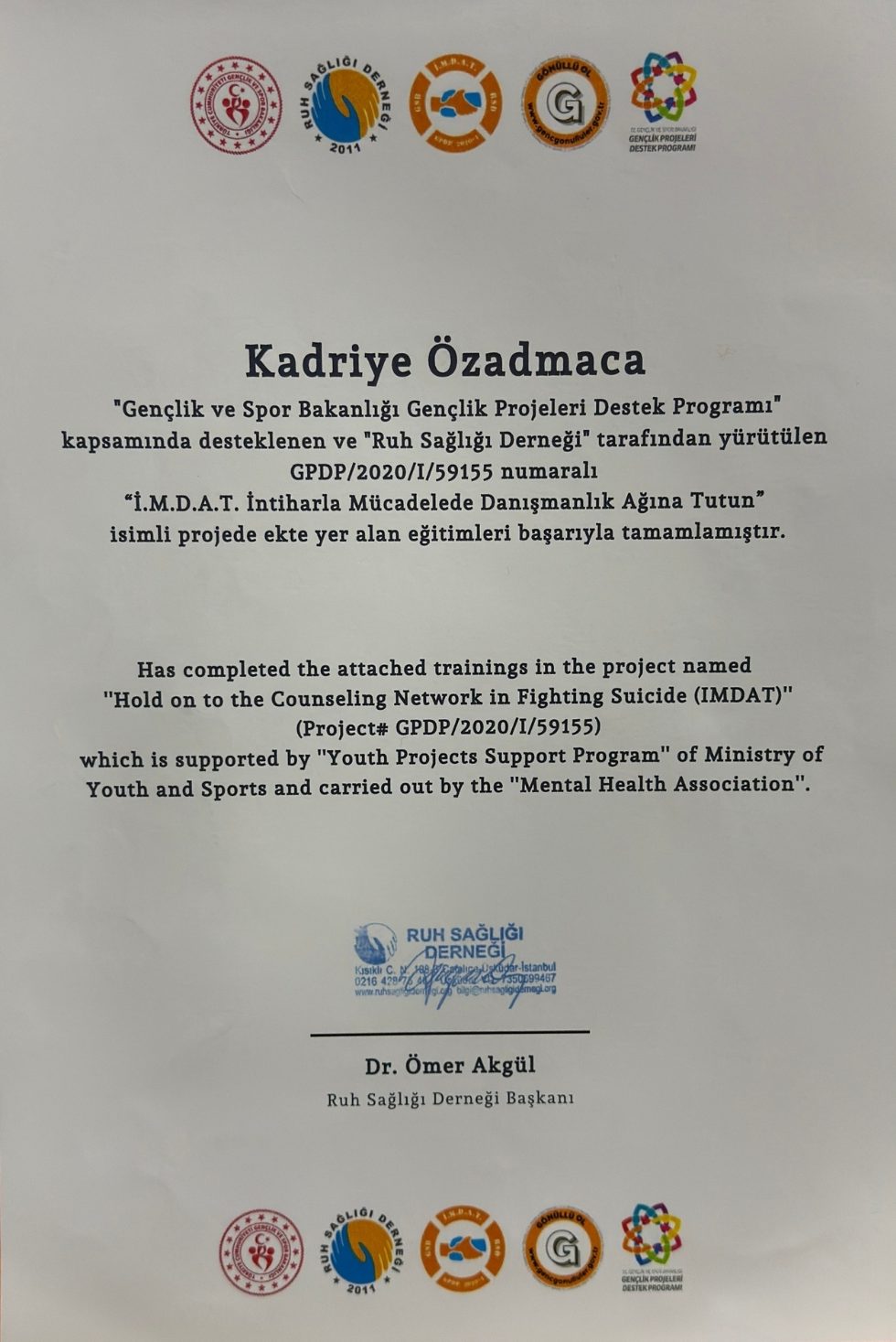 İ.M.D.A.T İNTİHARLA MÜCADELE DANIŞÖNALIK AĞINA TUTUN PROJESİ EĞİTİMİ SERTİFİKASI